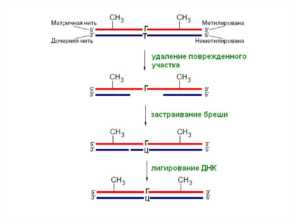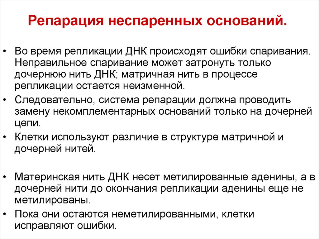 Репарация неспаренных оснований.• Во время репликации ДНК происходят ошибки спаривания.