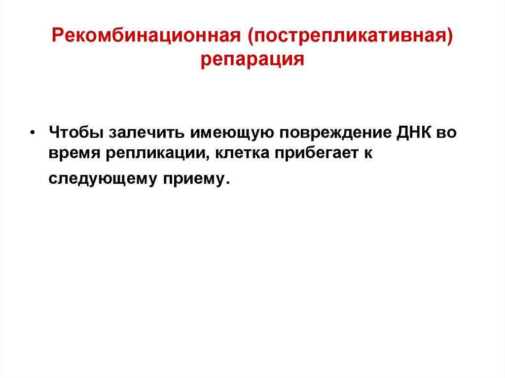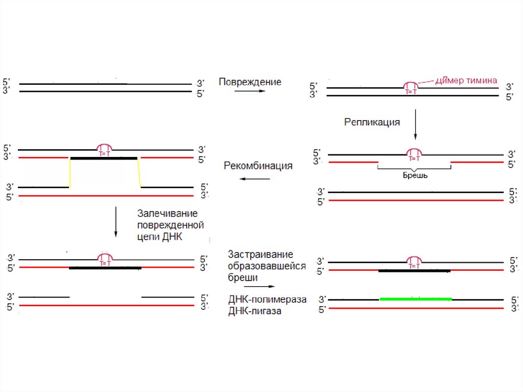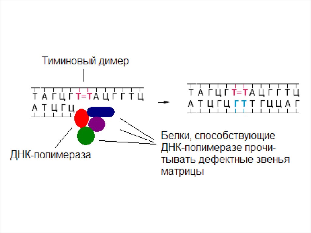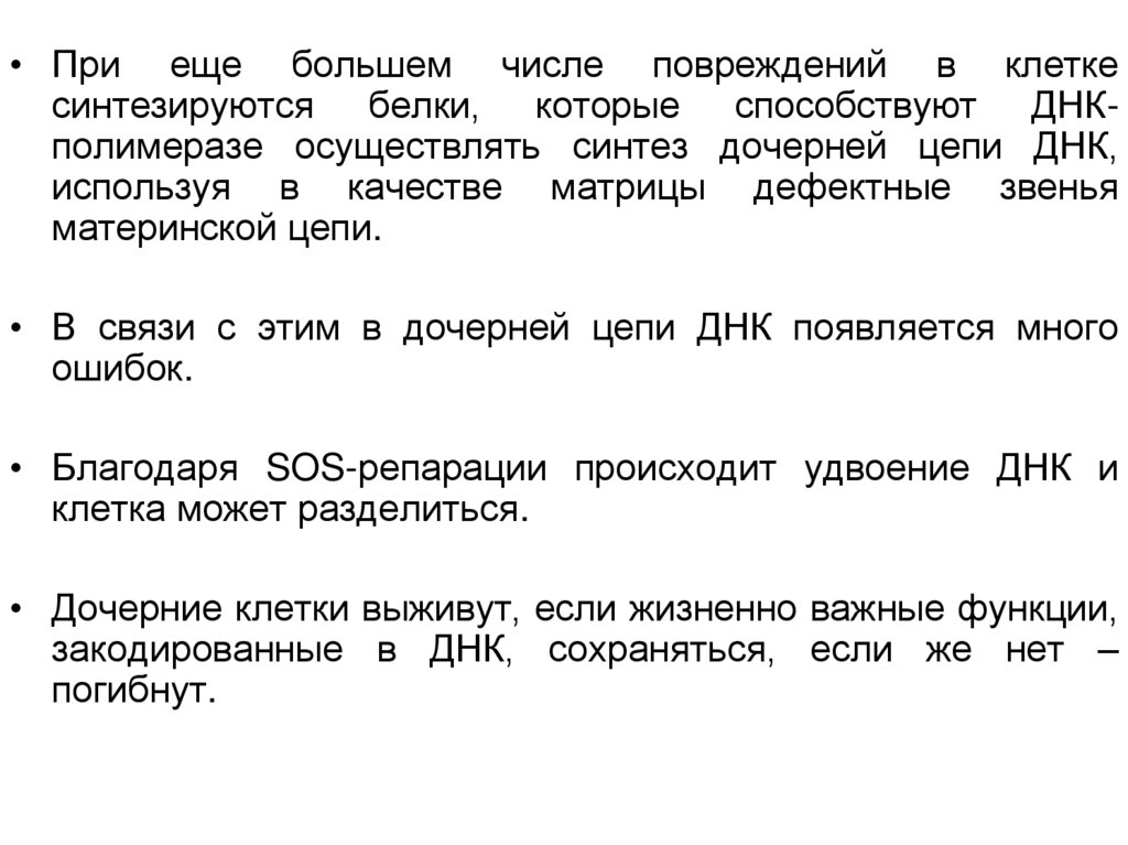 • При еще большем числе повреждений в клеткесинтезируются белки, которые способствуют ДНКполимеразе осуществлять синтез дочерней цепи ДНК,