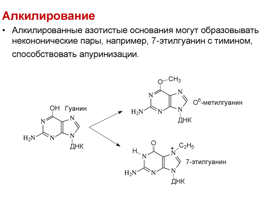 Алкилирование• Алкилированные азотистые основания могут образовывать