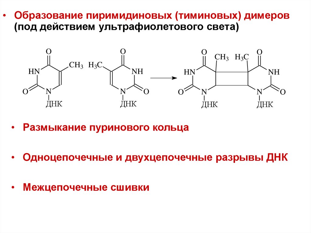 • Образование пиримидиновых (тиминовых) димеров(под действием ультрафиолетового света)