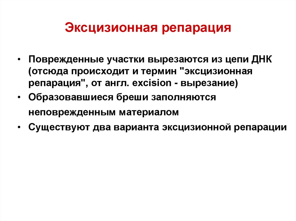 Эксцизионная репарация• Поврежденные участки вырезаются из цепи ДНК