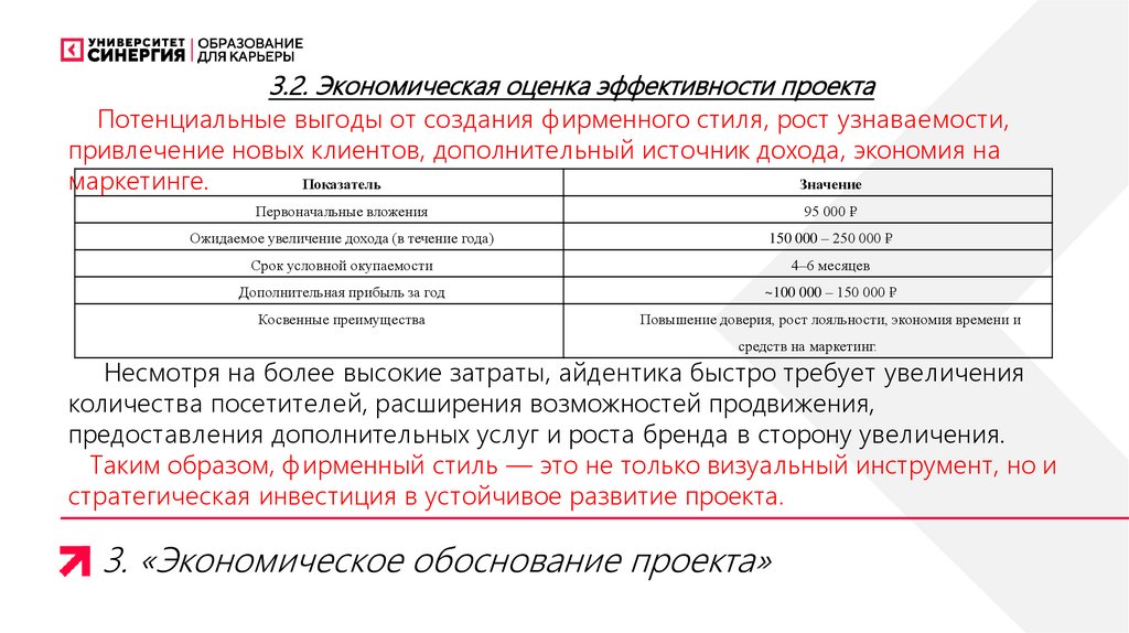 3.2. Экономическая оценка эффективности проектаПотенциальные выгоды от создания ф ирменного стиля, рост узнаваемости,