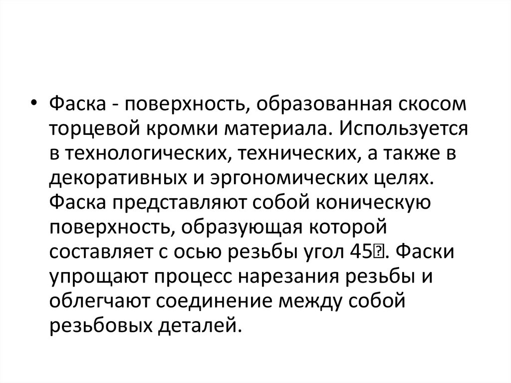 • Фаска - поверхность, образованная скосомторцевой кромки материала. Используется