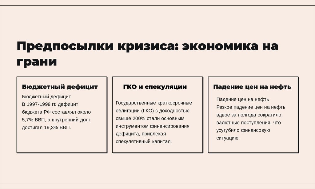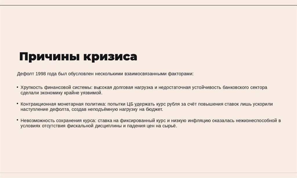 Причины кризисаДефолт 1998 года был обусловлен несколькими взаимосвязанными факторами: