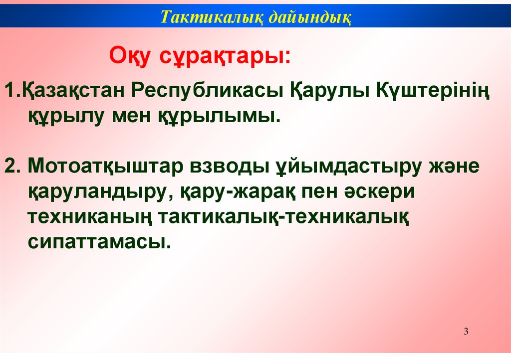 Тактикалық дайындықОқу сұрақтары: