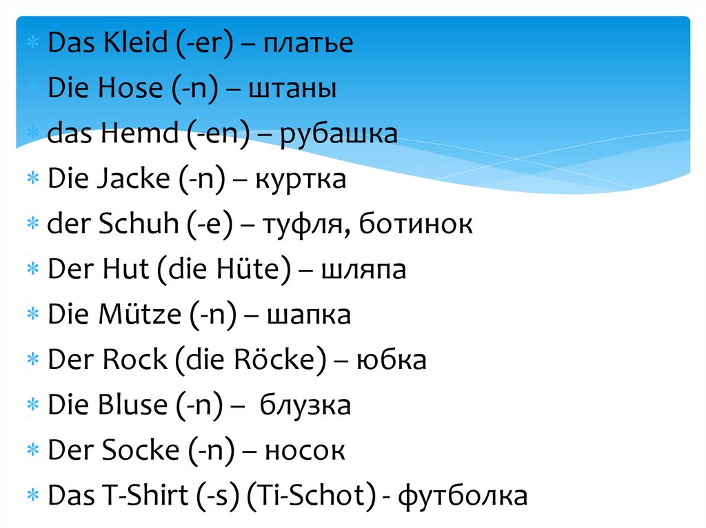 Das Kleid (-er) – платьеDie Hose (-n) – штаны