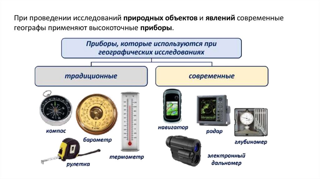 При проведении исследований природных объектов и явлений современныегеографы применяют высокоточные приборы.