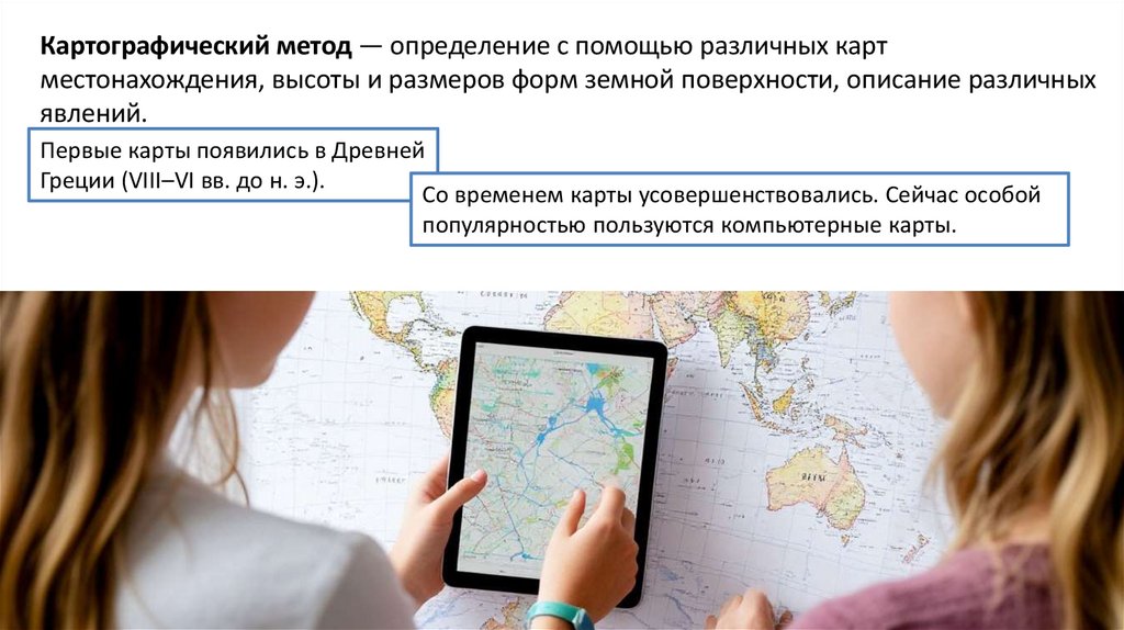 Картографический метод — определение с помощью различных картместонахождения, высоты и размеров форм земной поверхности, описание различных