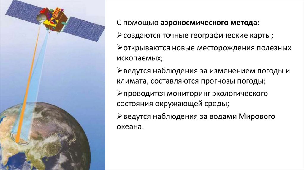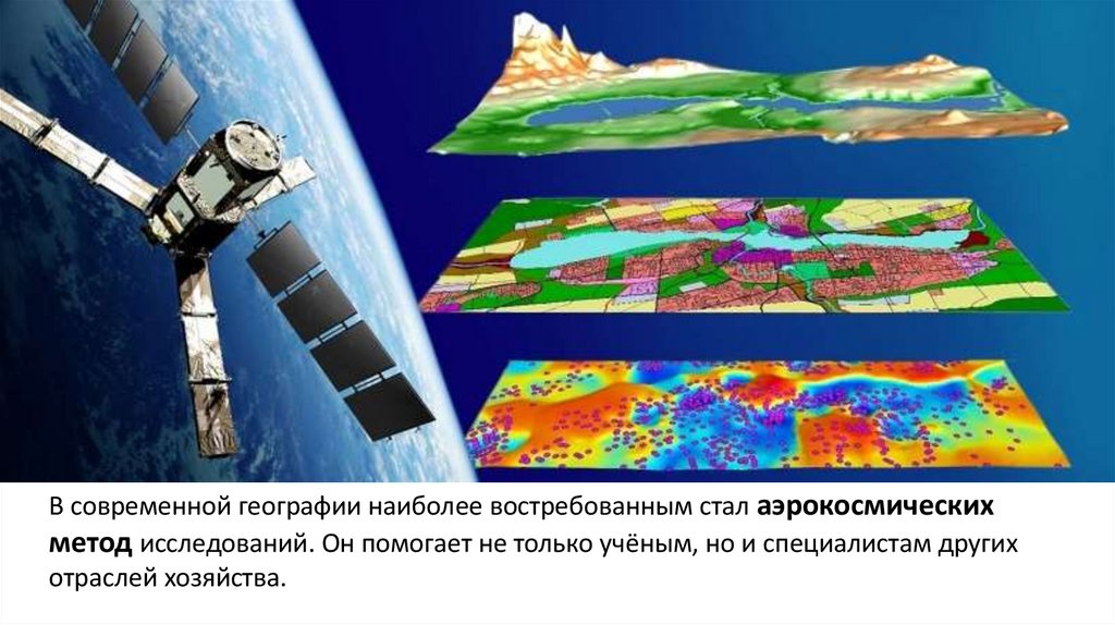 В современной географии наиболее востребованным стал аэрокосмическихметод исследований. Он помогает не только учёным, но и специалистам других