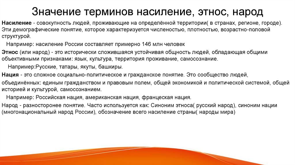 Значение терминов насиление, этнос, народНасиление - совокупность людей, проживающие на определённой территории( в странах, регионе, городе).