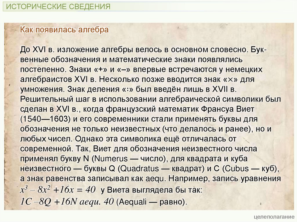 До XVI в. изложение алгебры велось в основном словесно. Буквенные обозначения и математические знаки появлялись