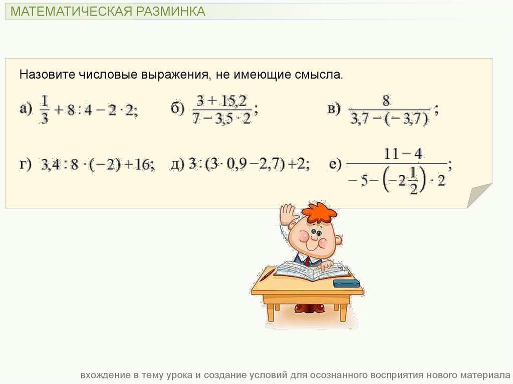 МАТЕМАТИЧЕСКАЯ РАЗМИНКАНазовите числовые выражения, не имеющие смысла.