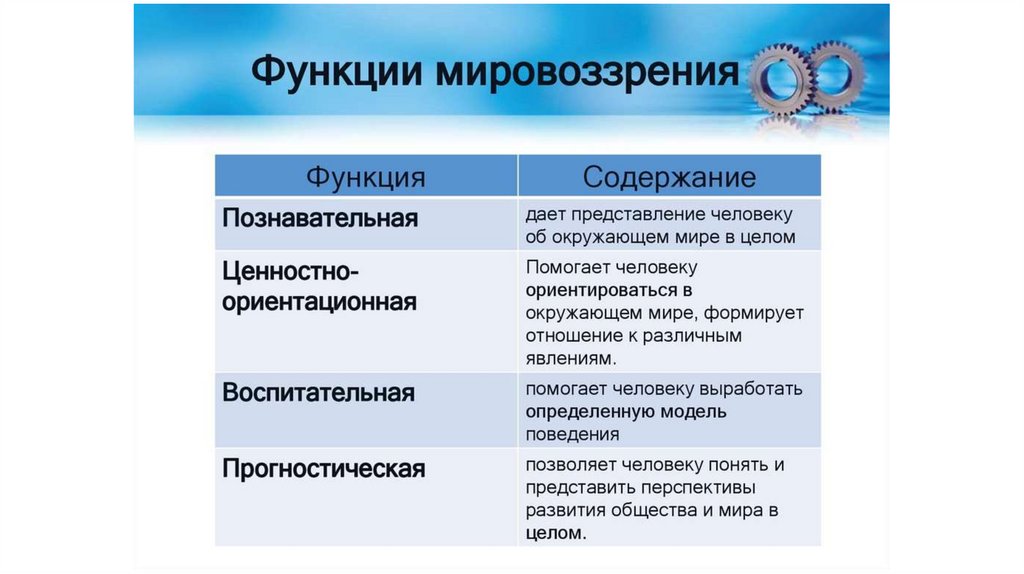 • Когнитивный компонент — представления о мире (научныетеории, обыденные знания, мифические представления).