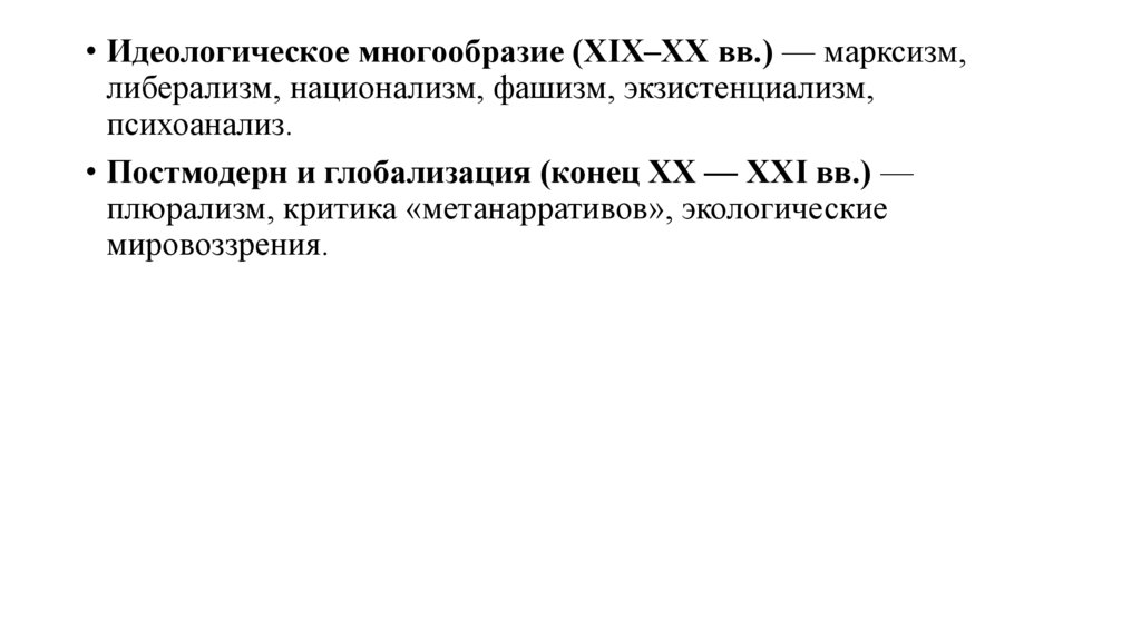 • Идеологическое многообразие (XIX–XX вв.) — марксизм,либерализм, национализм, фашизм, экзистенциализм,