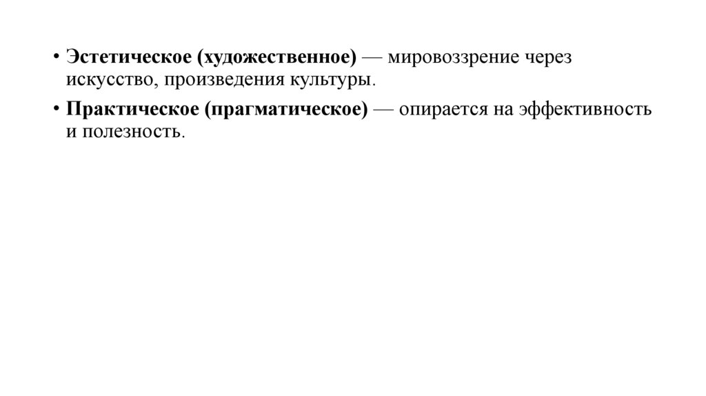 • Эстетическое (художественное) — мировоззрение черезискусство, произведения культуры.