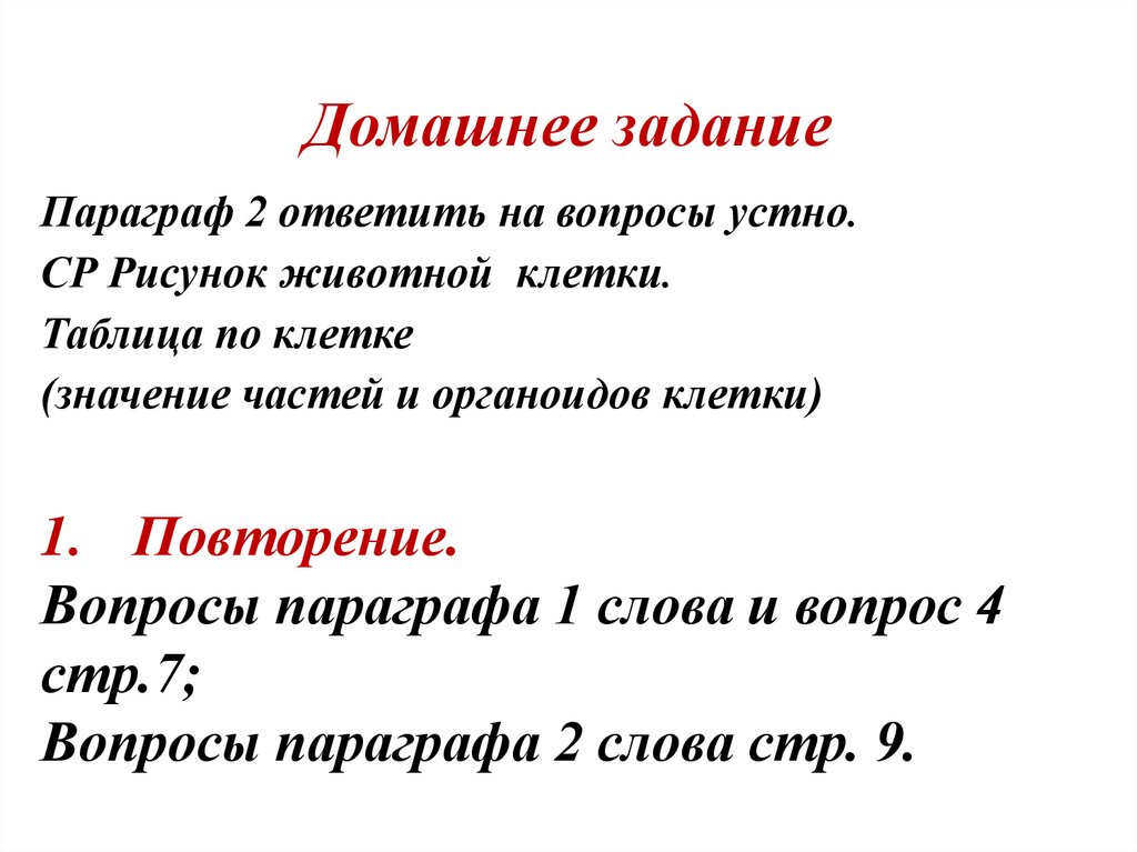 Параграф 2 ответить на вопросы устно.СР Рисунок животной клетки.