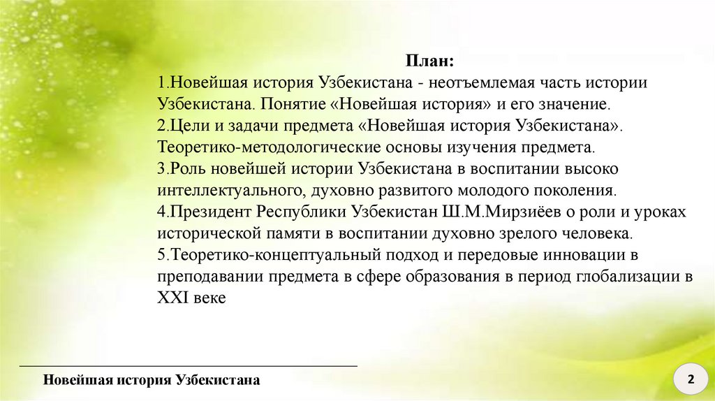 2.Цели и задачи предмета «Новейшая история Узбекистана».