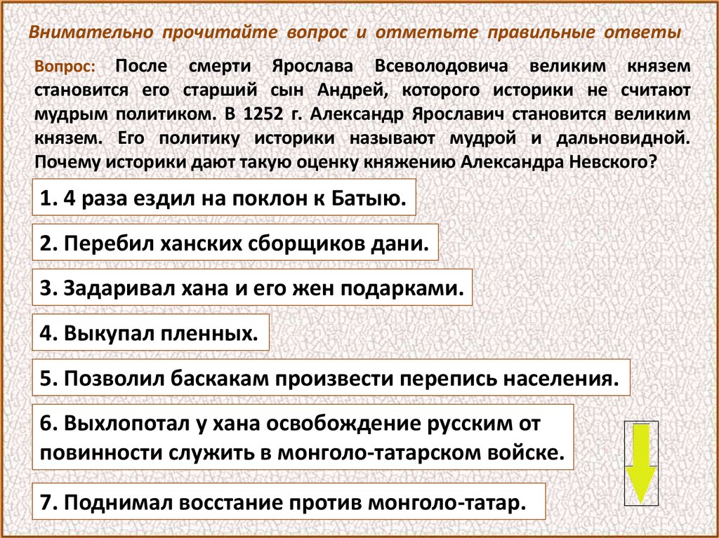 Внимательно прочитайте вопрос и отметьте правильные ответыПосле смерти Ярослава Всеволодовича великим князем