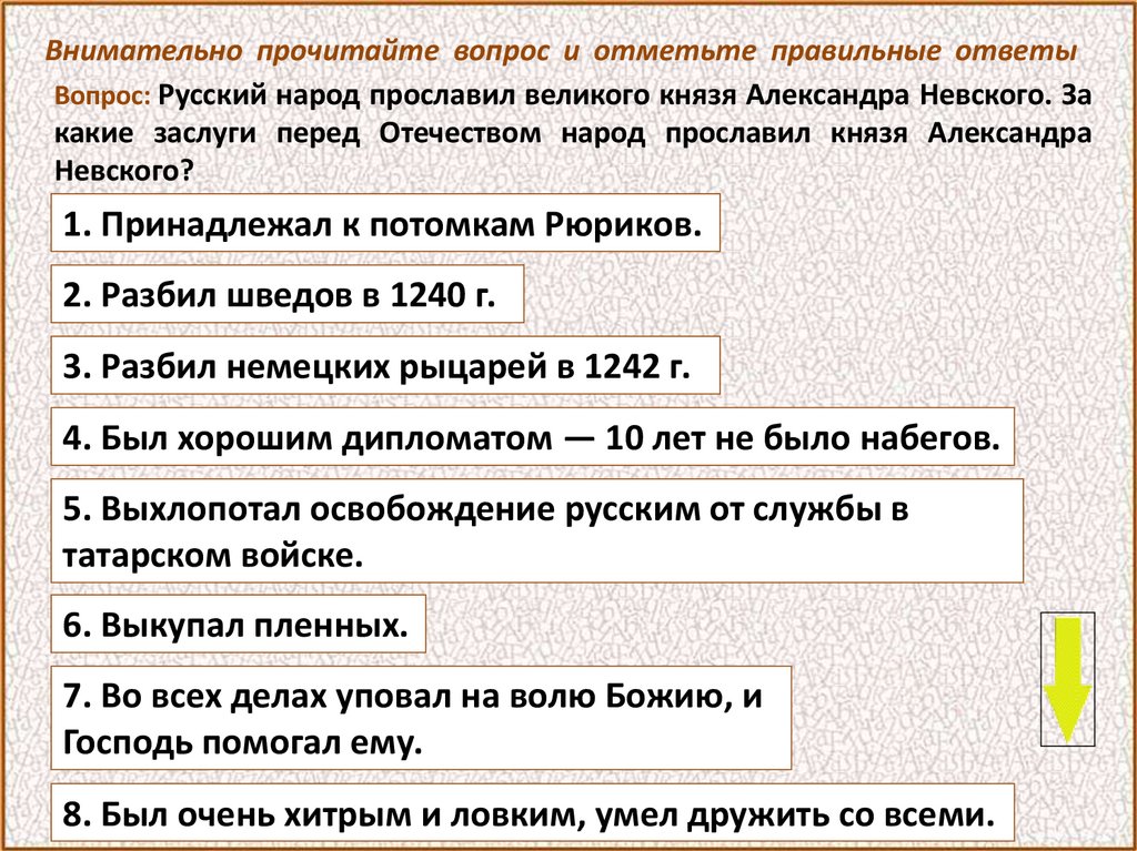 Внимательно прочитайте вопрос и отметьте правильные ответыВопрос: Русский народ прославил великого князя Александра Невского. За