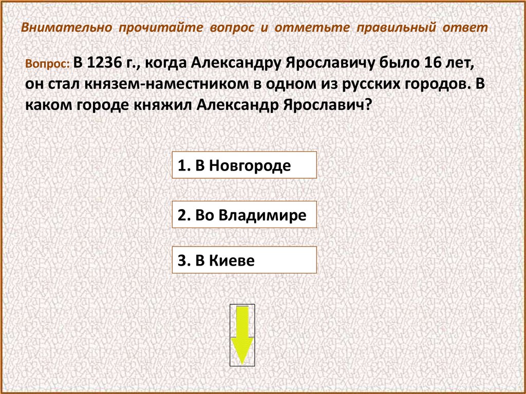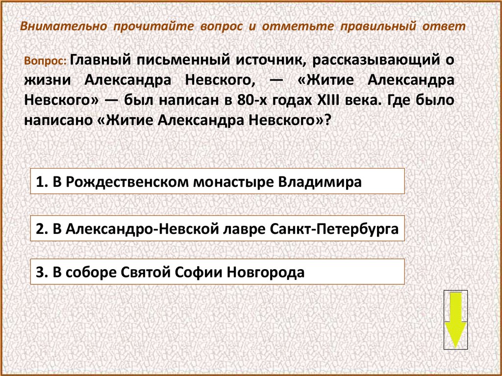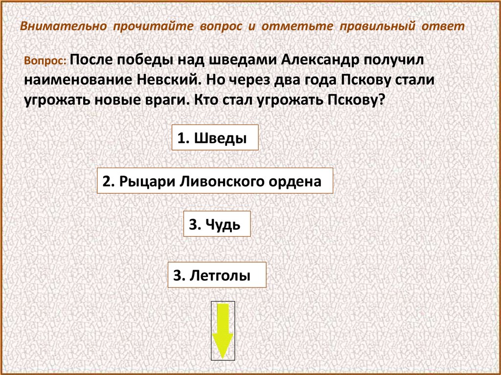 Внимательно прочитайте вопрос и отметьте правильный ответВопрос: После победы над шведами Александр получил