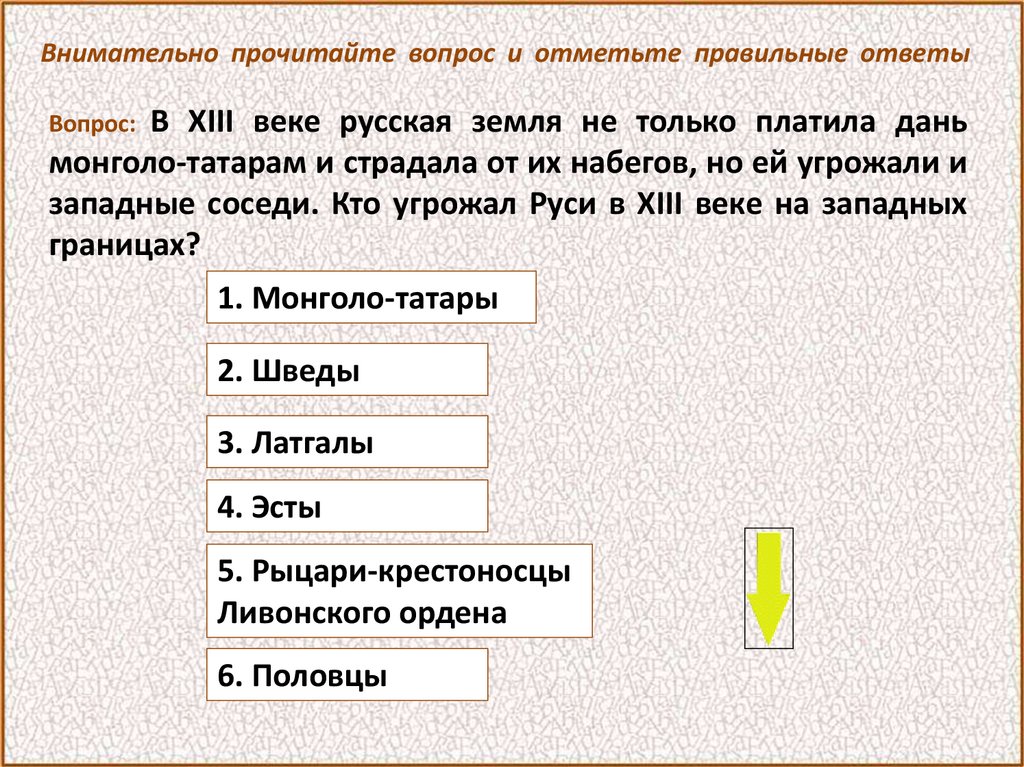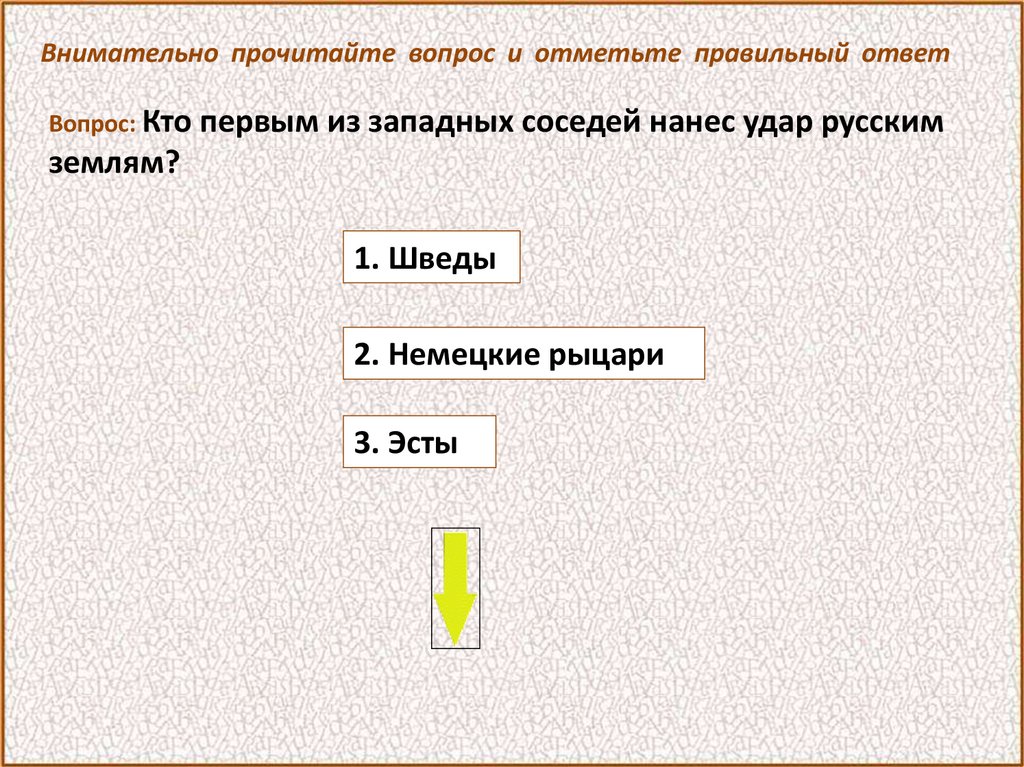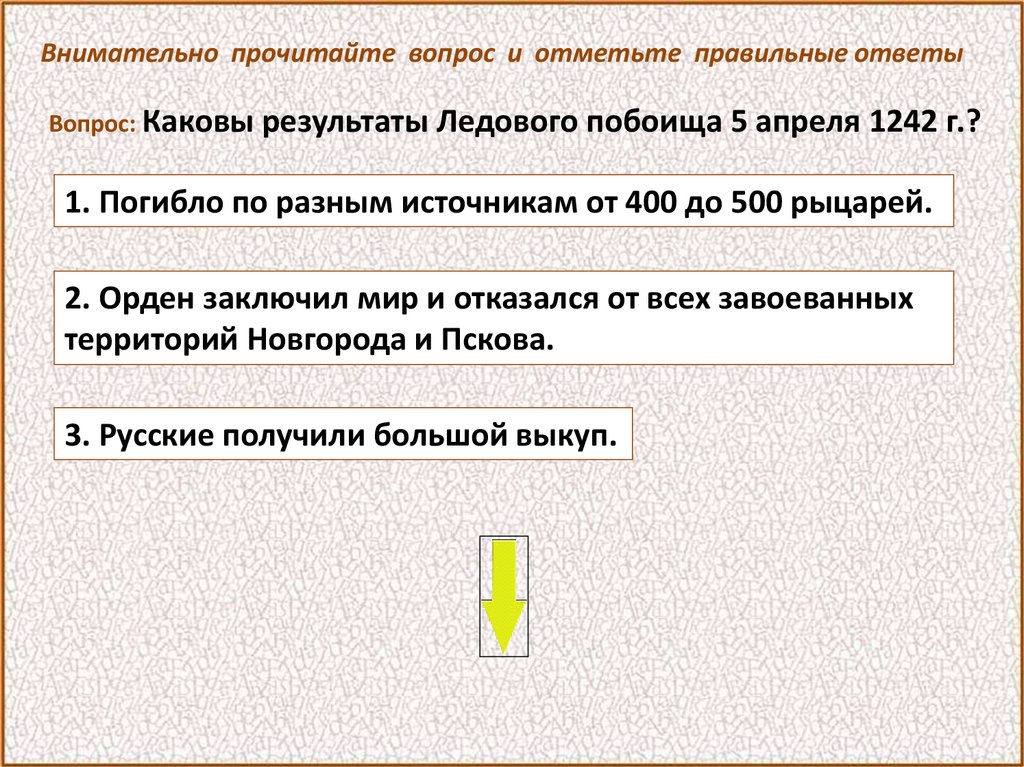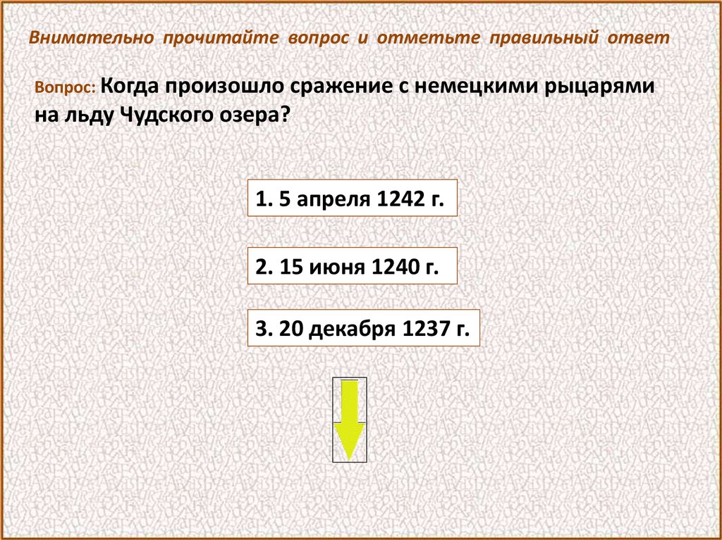 Внимательно прочитайте вопрос и отметьте правильный ответВопрос: Когда произошло сражение с немецкими рыцарями