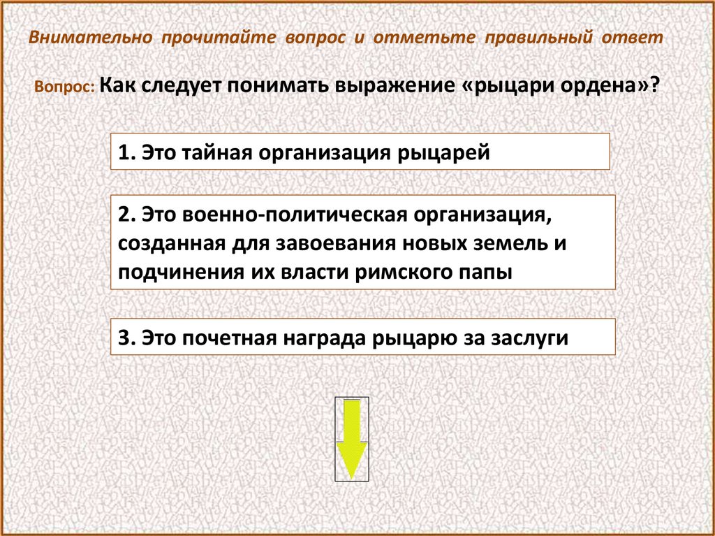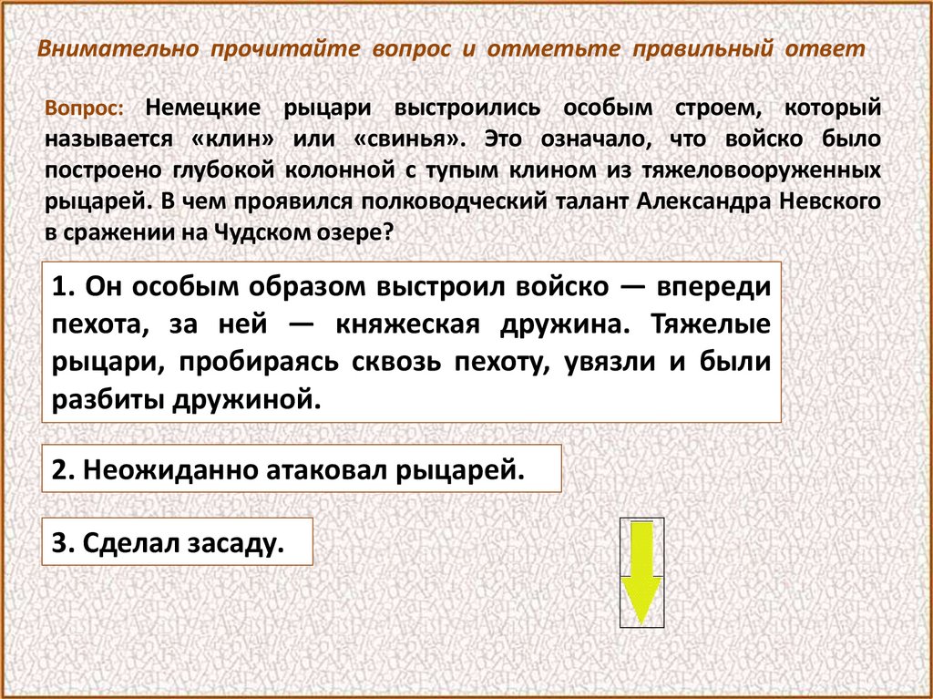 Внимательно прочитайте вопрос и отметьте правильный ответВопрос: Немецкие рыцари выстроились особым строем, который