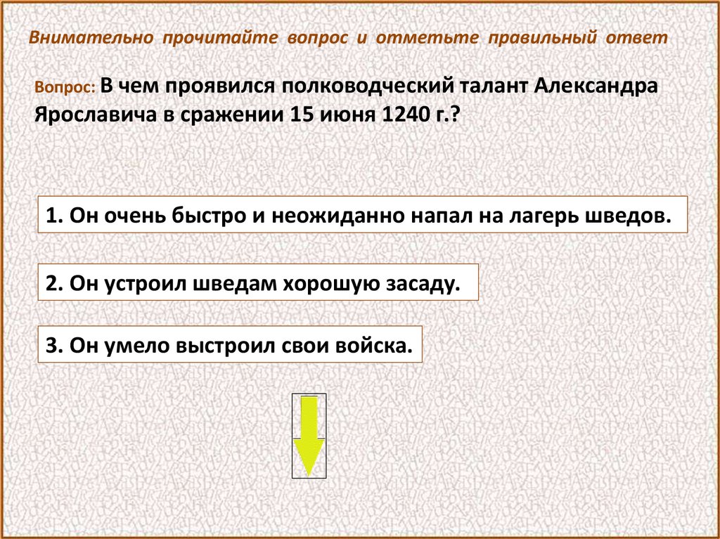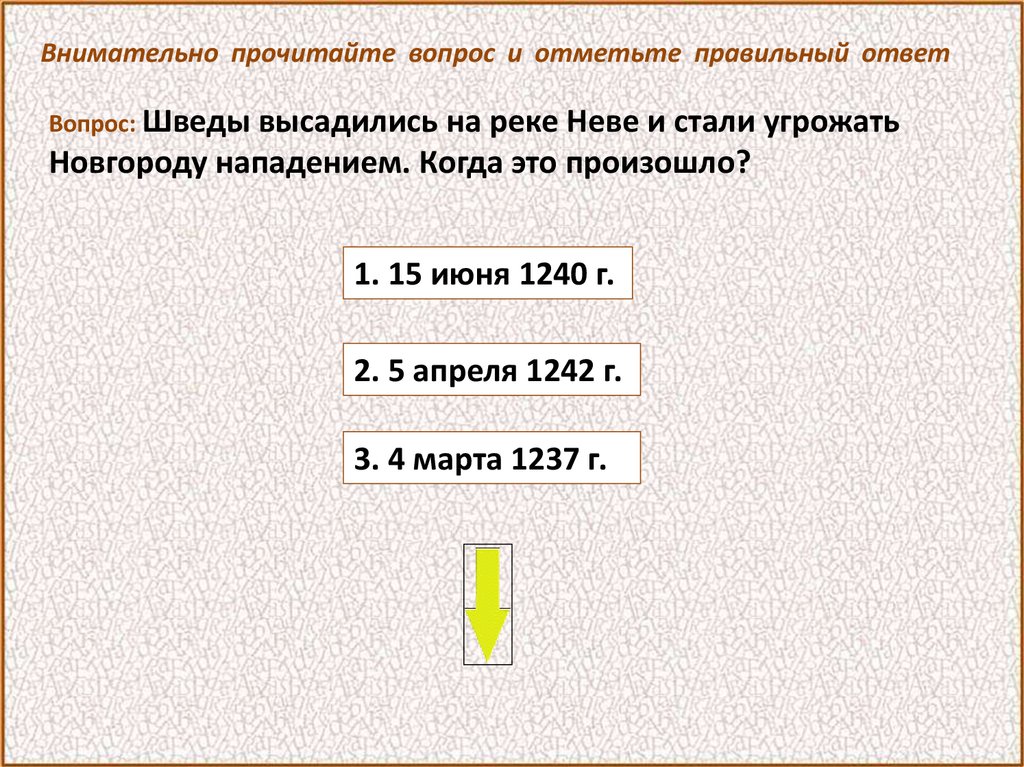 Внимательно прочитайте вопрос и отметьте правильный ответВопрос: Шведы высадились на реке Неве и стали угрожать