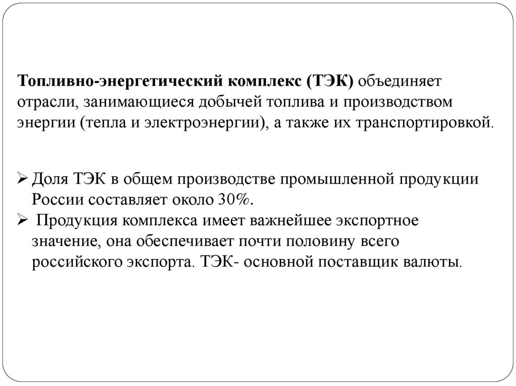 Топливно-энергетический комплекс (ТЭК) объединяетотрасли, занимающиеся добычей топлива и производством