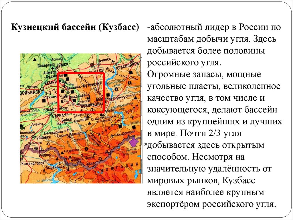 Кузнецкий бассейн (Кузбасс) -абсолютный лидер в России помасштабам добычи угля. Здесь