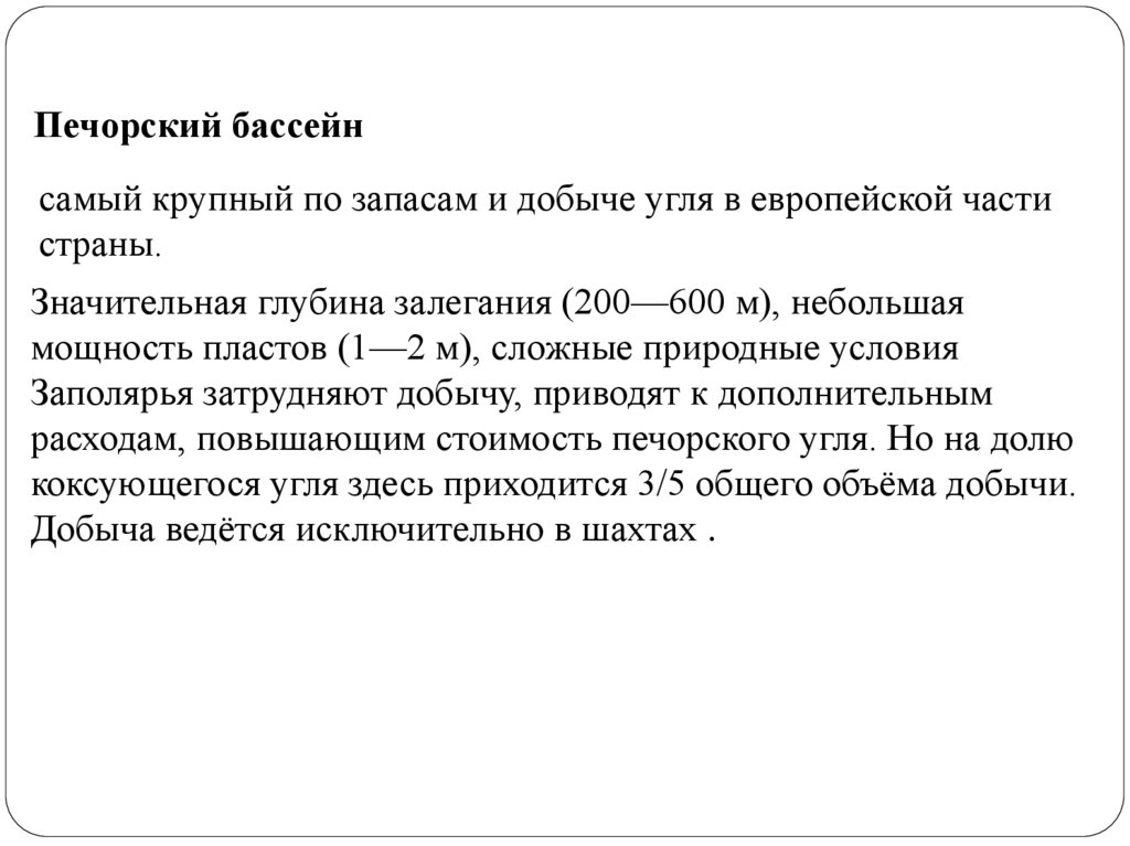 Печорский бассейнсамый крупный по запасам и добыче угля в европейской части