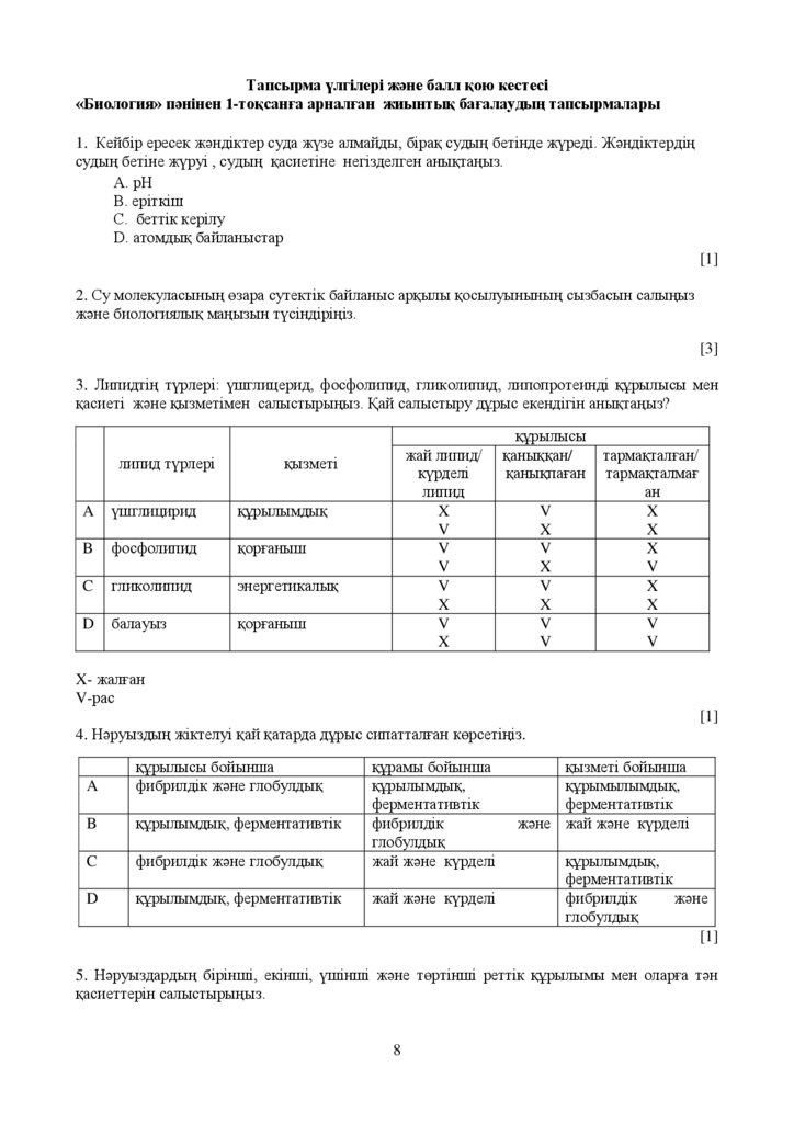 Тапсырма үлгілері және балл қою кестеcі«Биология» пәнінен 1-тоқсанға арналған жиынтық бағалаудың тапсырмалары