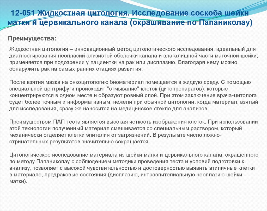 12-051 Жидкостная цитология. Исследование соскоба шейки матки ицервикального канала (окрашивание по Папаниколау)