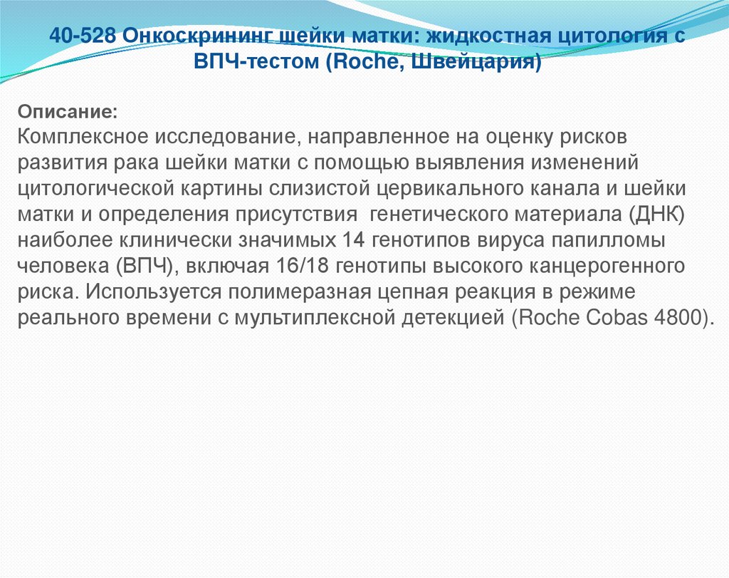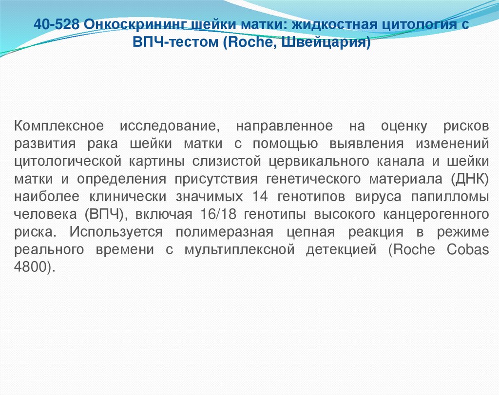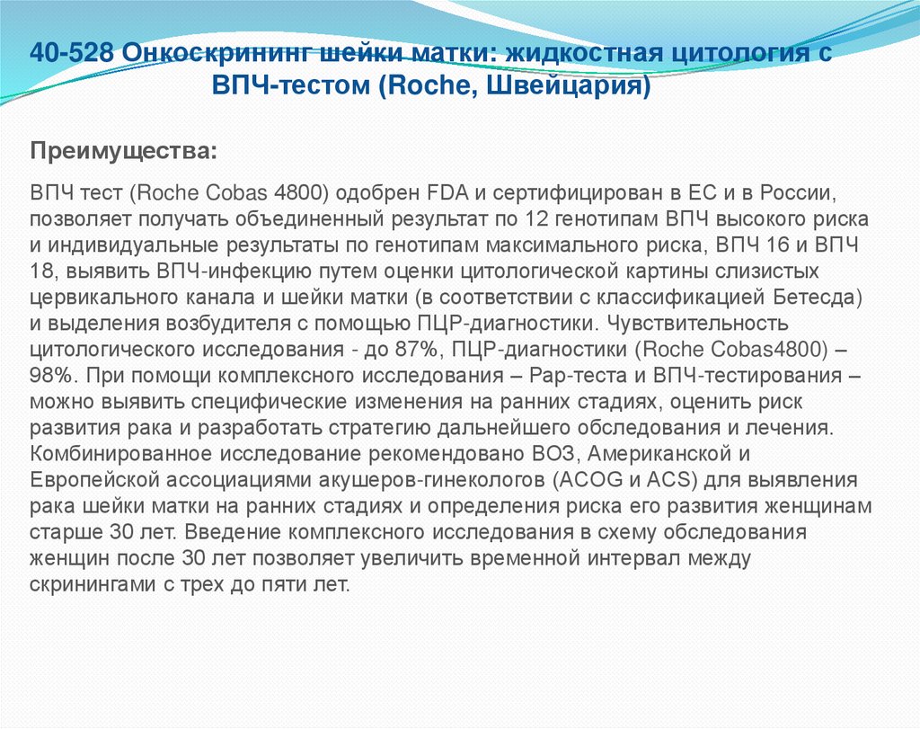 40-528 Онкоскрининг шейки матки: жидкостная цитология cВПЧ-тестом (Roche, Швейцария)