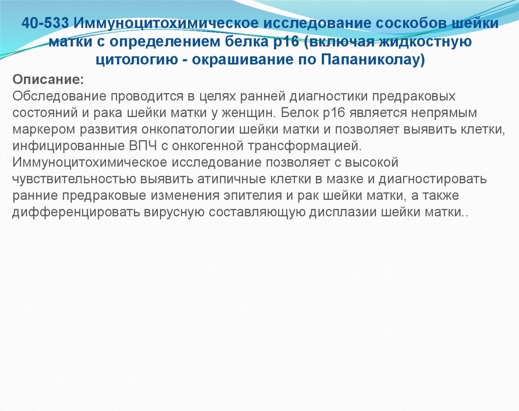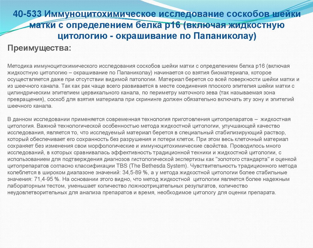 40-533 Иммуноцитохимическое исследование соскобов шейкиматки с определением белка р16 (включая жидкостную