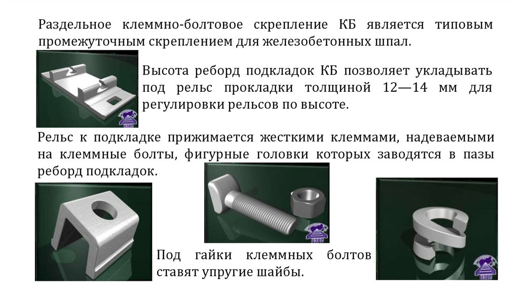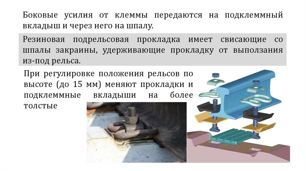 Боковые усилия от клеммы передаются на подклеммныйвкладыш и через него на шпалу.