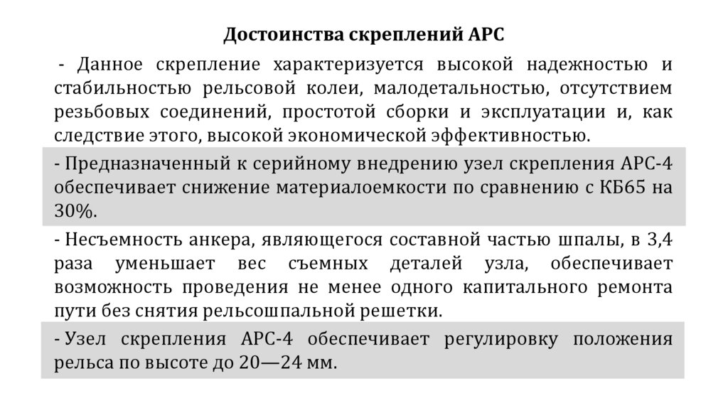 Достоинства скреплений АРС- Данное скрепление характеризуется высокой надежностью и
