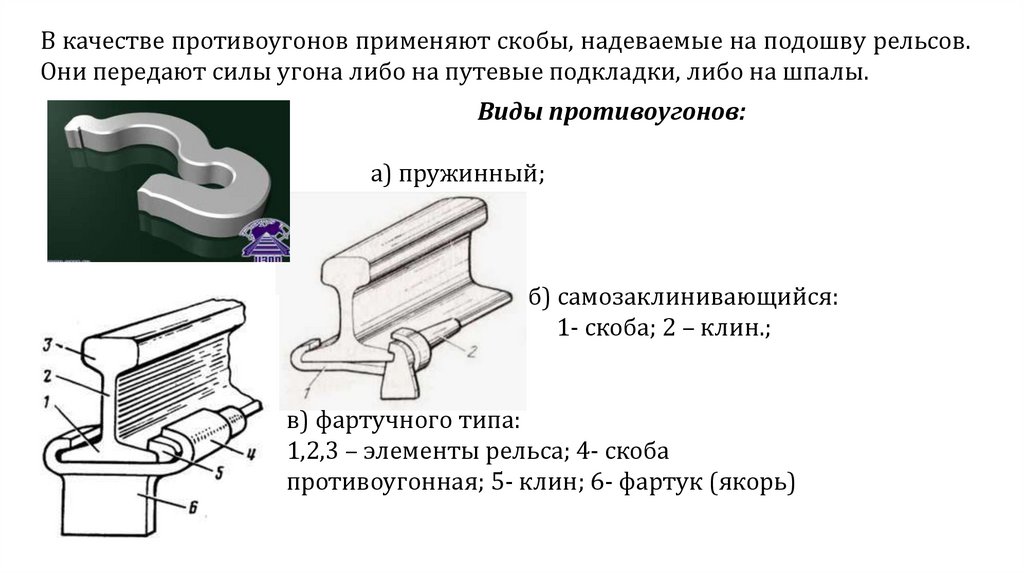 В качестве противоугонов применяют скобы, надеваемые на подошву рельсов.Они передают силы угона либо на путевые подкладки, либо на шпалы.