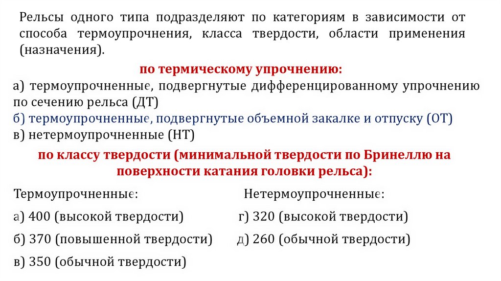Рельсы одного типа подразделяют по категориям в зависимости отспособа термоупрочнения, класса твердости, области применения