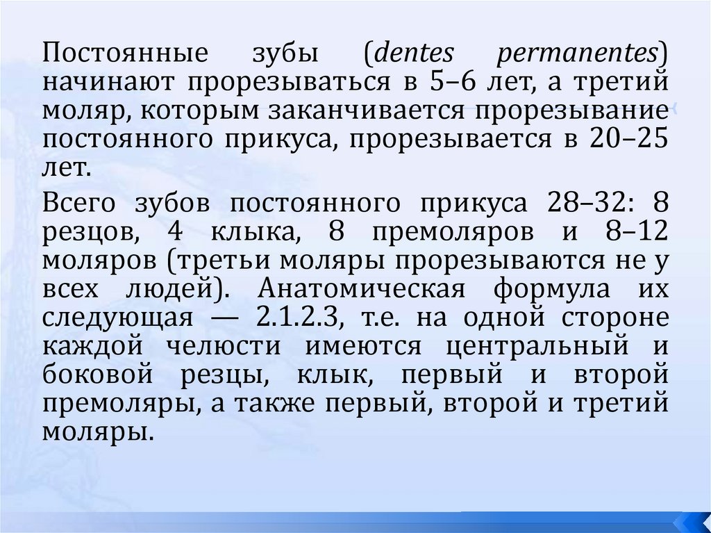 Постоянные зубы (dentes permanentes)начинают прорезываться в 5–6 лет, а третий