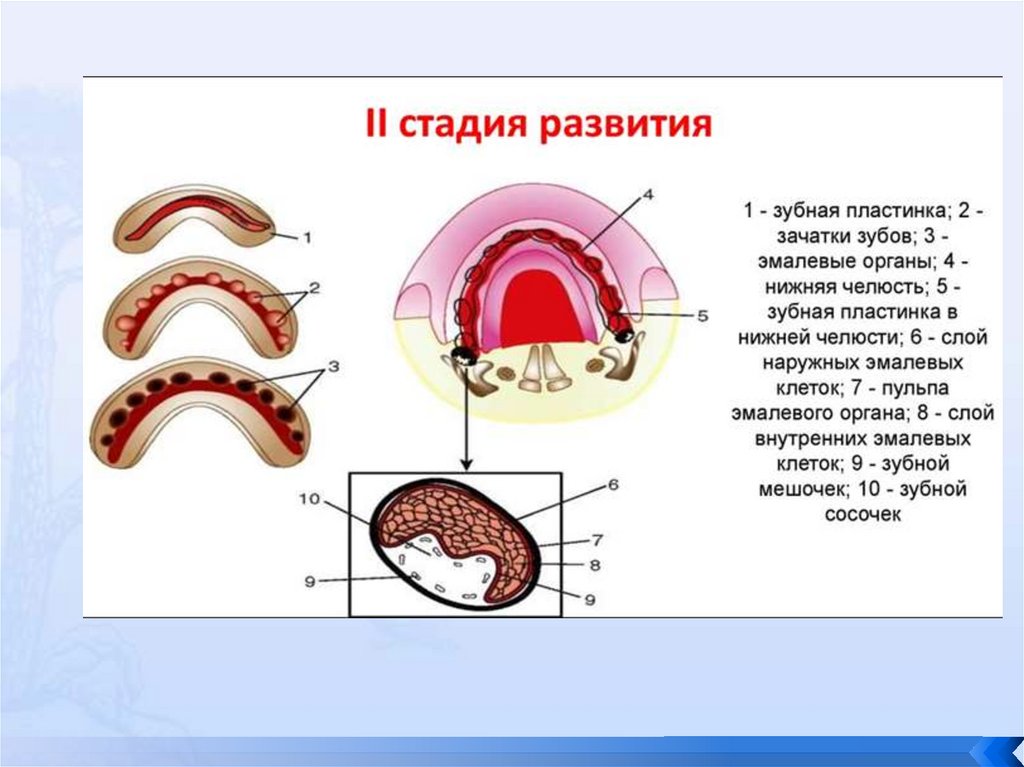 На второй стадии (8-12 неделя) начинаетсядифференцировка зубного зачатка. Эмалевый