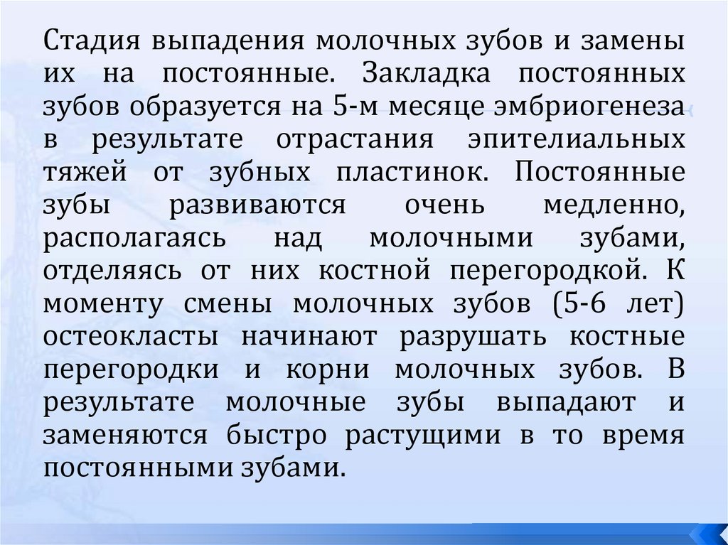 Стадия выпадения молочных зубов и заменыих на постоянные. Закладка постоянных