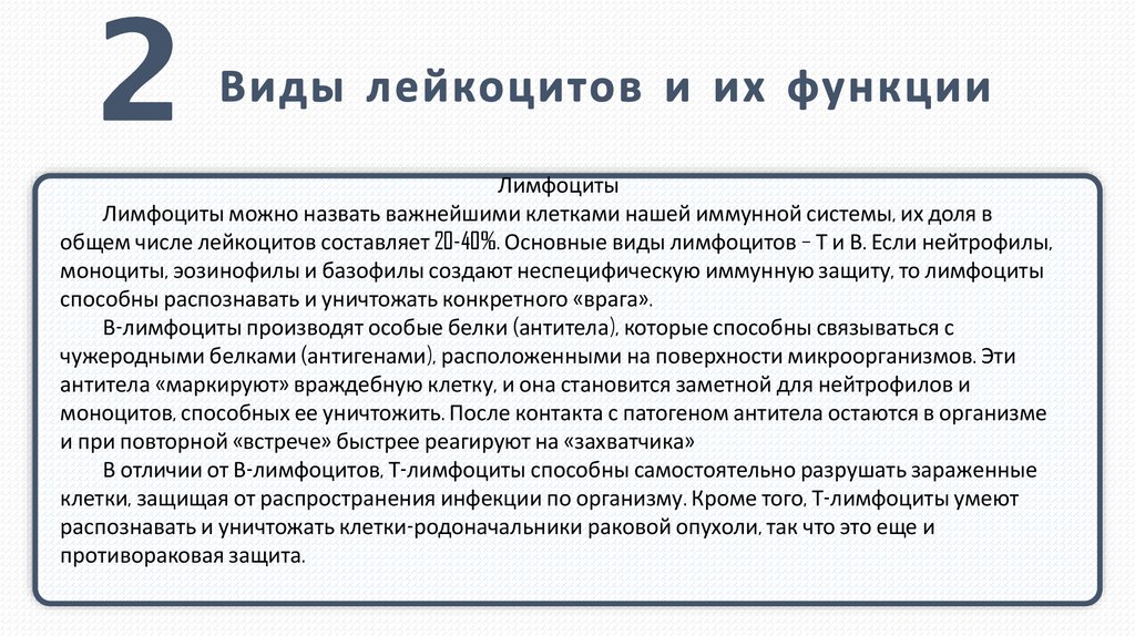 общем числе лейкоцитов составляет 20-40%. Основные виды лимфоцитов – Т и В. Если нейтрофилы,