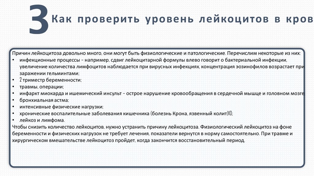 Как проверить уровень лейкоцитов в кровиПричин лейкоцитоза довольно много, они могут быть физиологические и патологические. Перечислим некоторые из них: