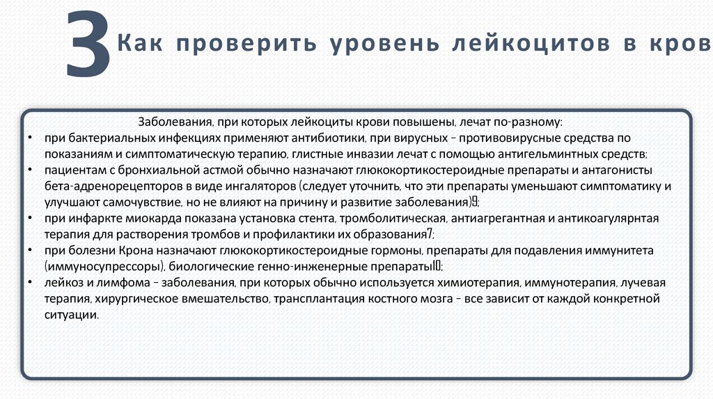 Как проверить уровень лейкоцитов в кровиЗаболевания, при которых лейкоциты крови повышены, лечат по-разному: