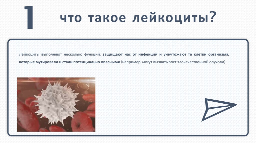 что такое лейкоциты?Лейкоциты выполняют несколько функций: защищают нас от инфекций и уничтожают те клетки организма,
