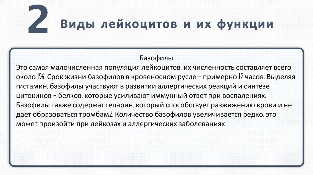 Базофилы также содержат гепарин, который способствует разжижению крови и не дает образоваться тромбам2.