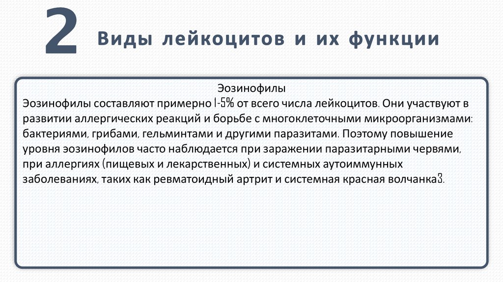 ЭозинофилыЭозинофилы составляют примерно 1-5% от всего числа лейкоцитов. Они участвуют в