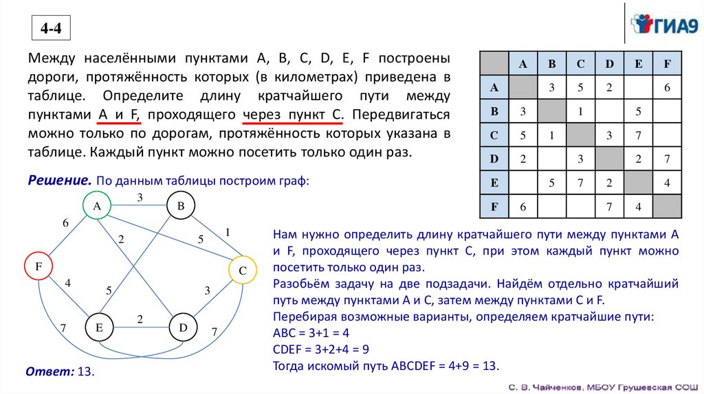 Тогда искомый путь ABCDEF = 4+9 = 13.