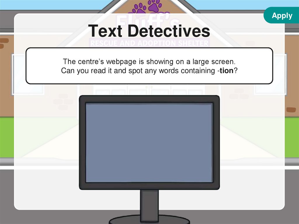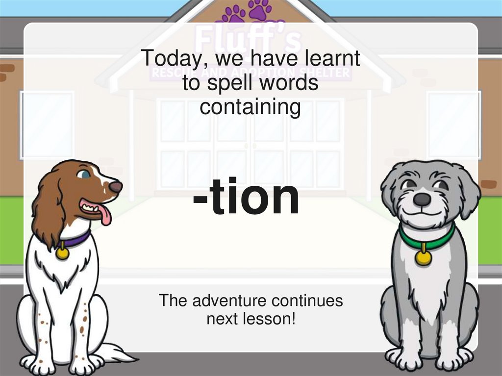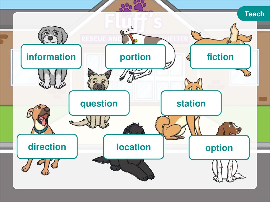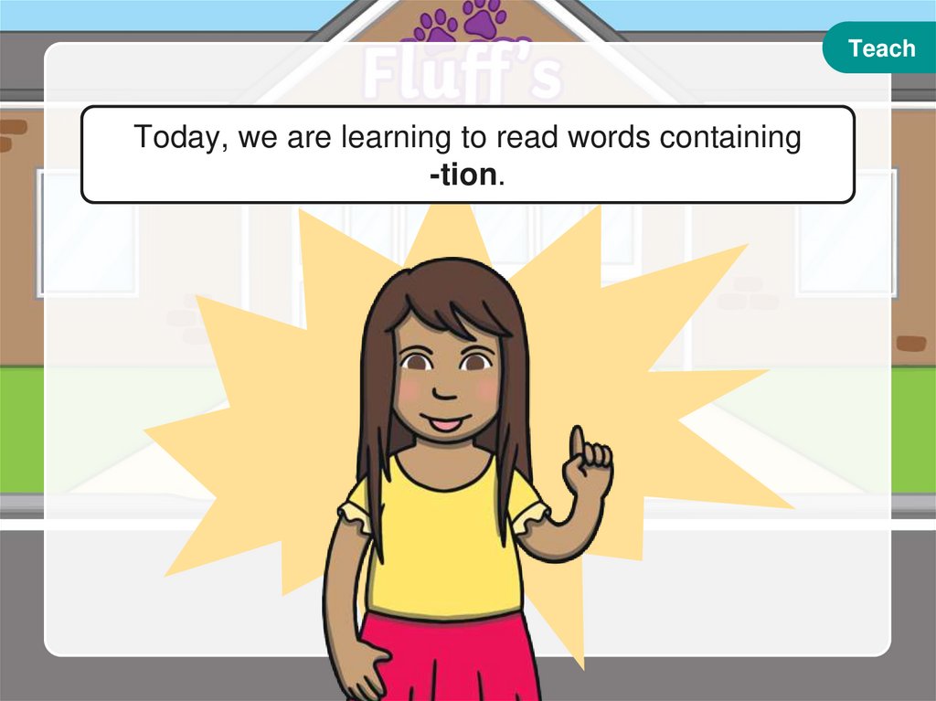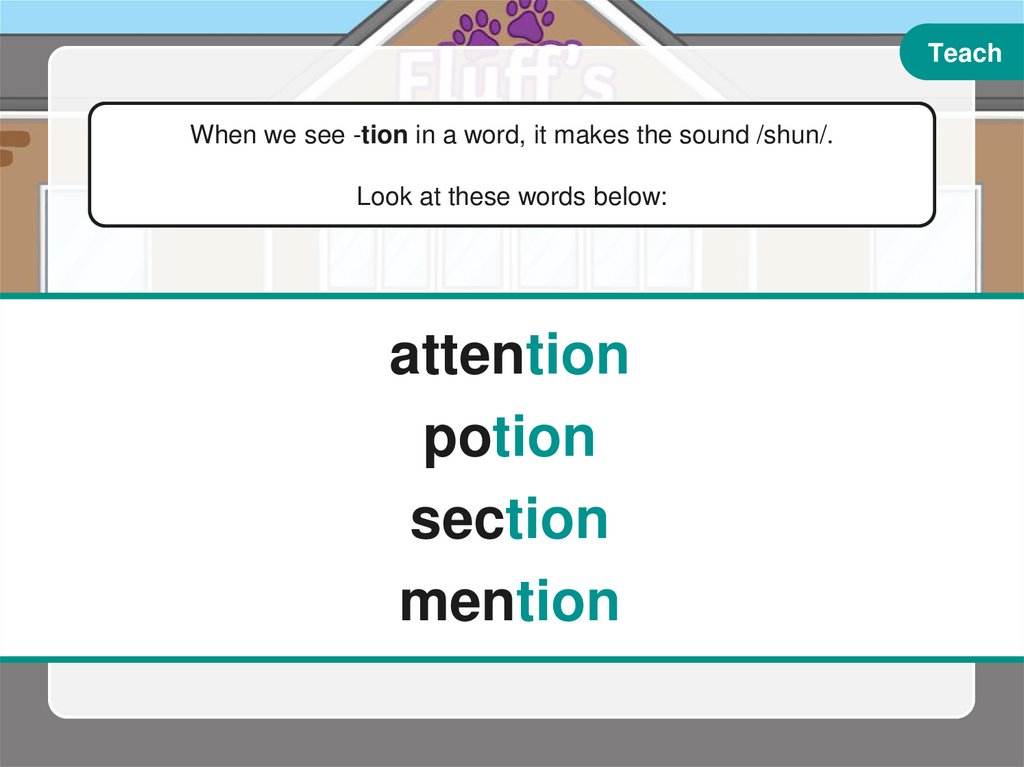 TeachWhen we see -tion in a word, it makes the sound /shun/.