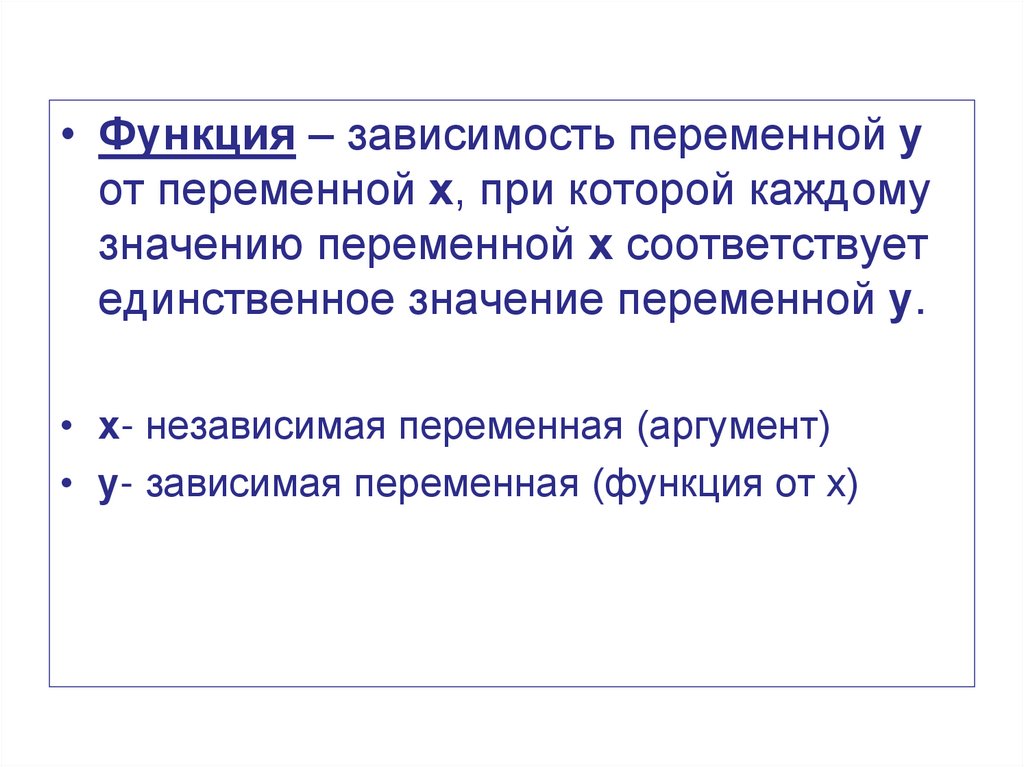 • Функция – зависимость переменной уот переменной х, при которой каждому